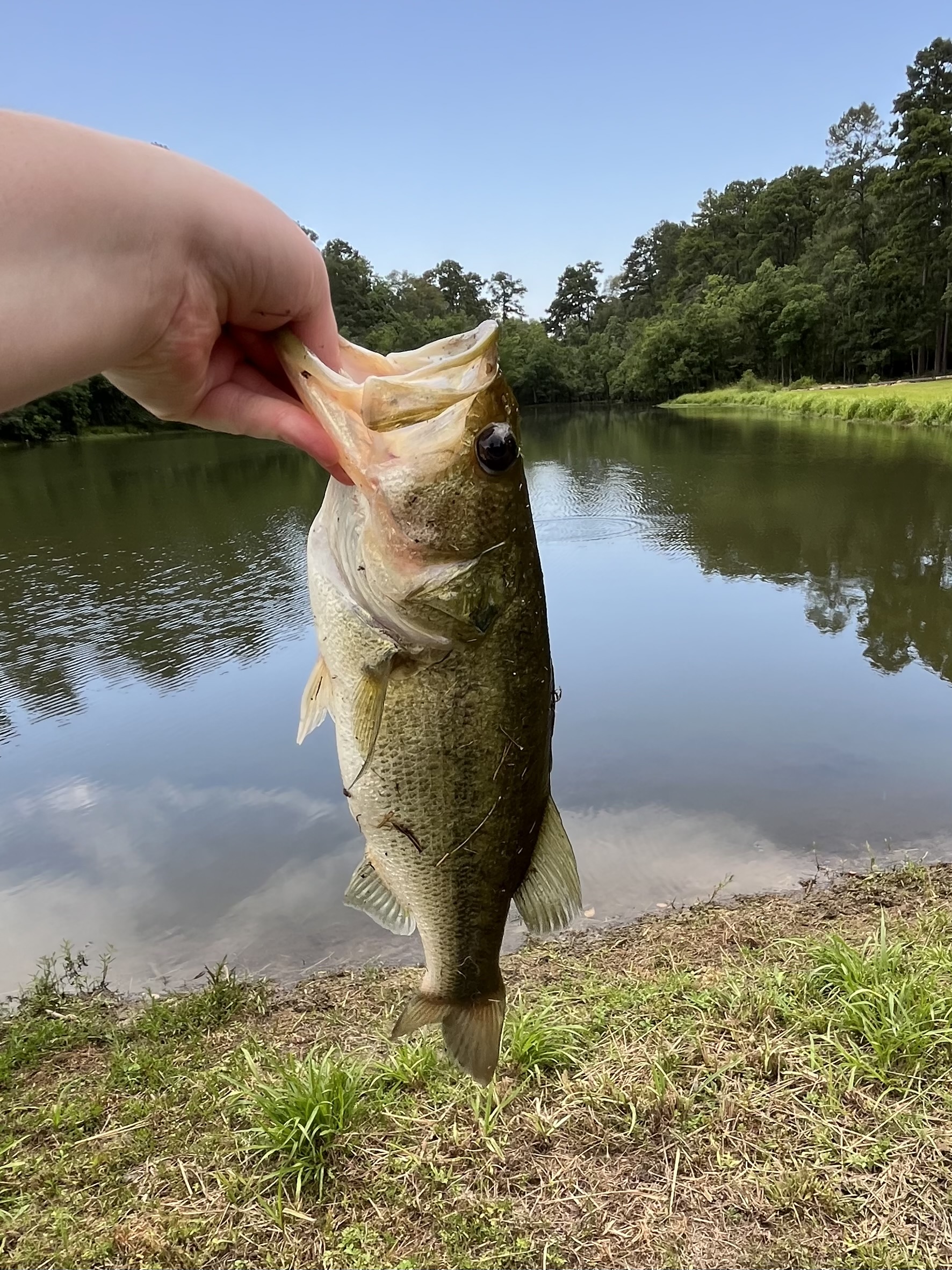 This large mouth bass (probably female due to the large bucket mouth) was caught in a private pond in Magnolia, Mississippi by my 14 year-old-son, Spencer Brumfield. Spencer loves fishing. Bass fishing is his preference with trout being second. He’s an avid fisherman who loves the water and thrill of the catch. He’s not in it for the biggest catch or mounting, just for the thrill of the reel. He aims to have a bass boat one day, but in the meantime, he’s settling for a 2-seater kayak. This catch was snagged with a white pearl shad, soft plastic, swim bait by Berkley.