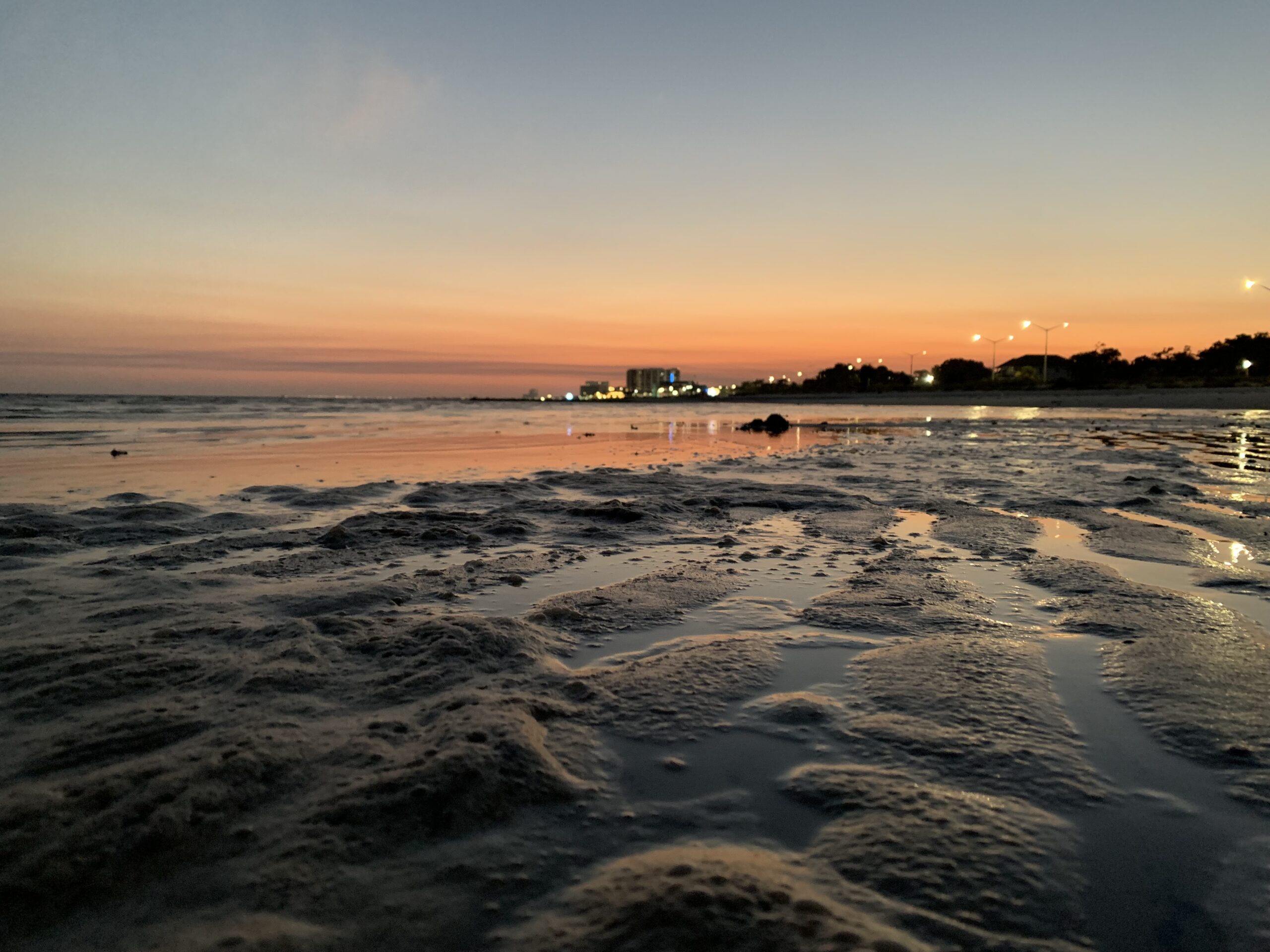 Biloxi Mississippi , gulf coast sunset. It was 71 degrees outside and the tide was almost completely out .