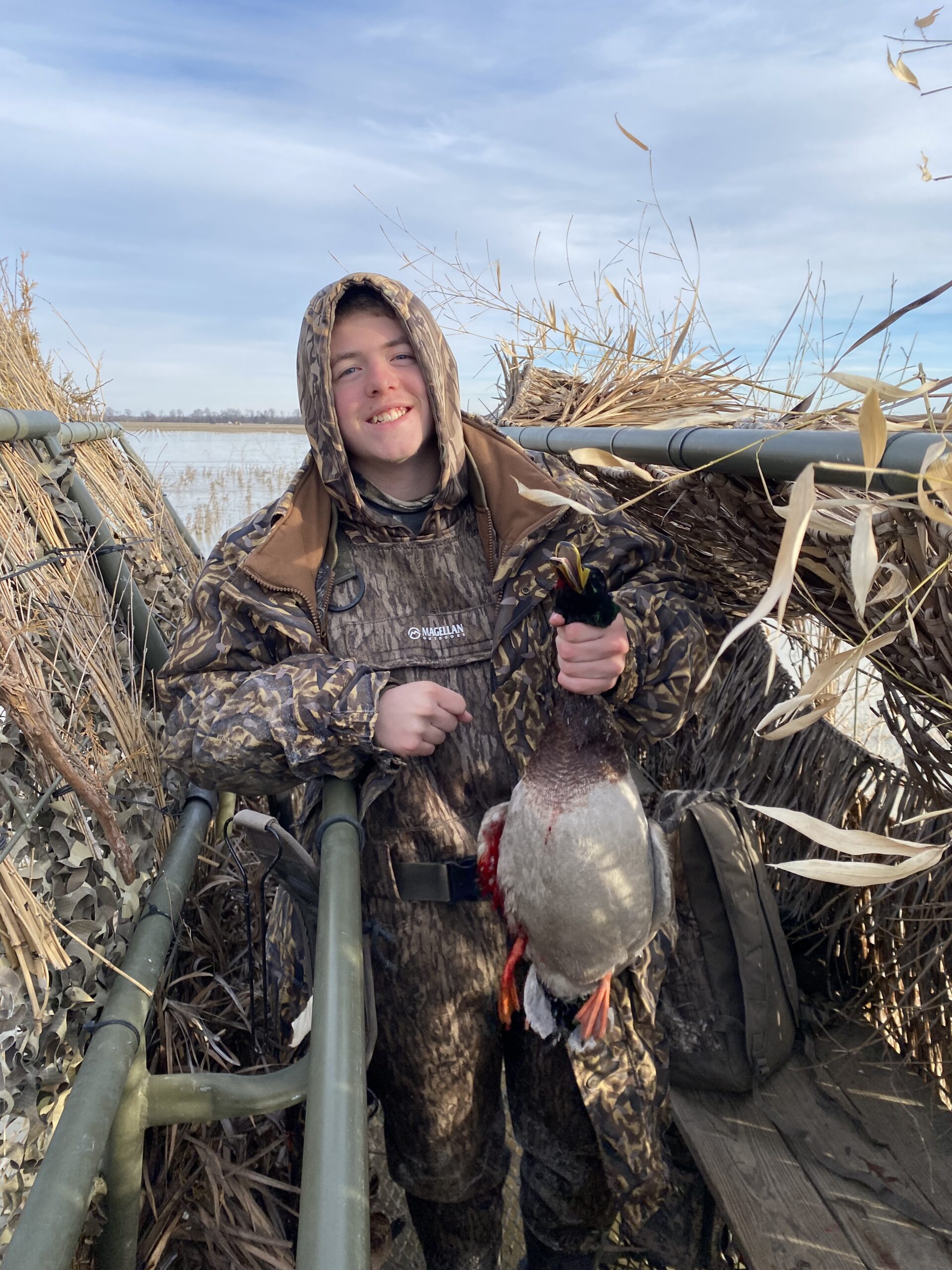 My 16 year old son Mitch while hunting with me in a flooded bean field in the delta was able to harvest his first Mallard this year. The drake made 2 passes and cupped on his side of the blind and Mitch was able to connect.