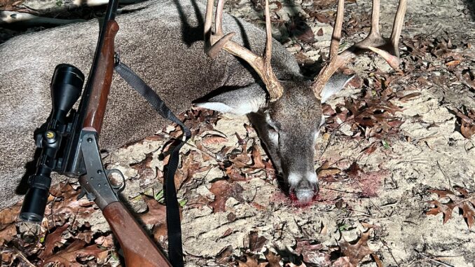I’m Corey Applewhite, I shot this buck quartering away moving fairly quick. The old 45-70 broke him down! Piled him up where he was standing. Jefferson Davis Co.